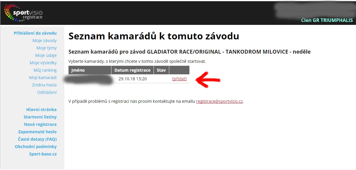 Jak najít kamaráda? Stačí zadat jeho email nebo se ho zeptejte na jeho registrační číslo, které najdete po přihlášení vpravo nahoře (to Vaše je ::::::::::::::::). My mu pošleme Vaši pozvánku s vysvětlením, jak jí potvrdit. Vaše kamarády si pak musíte přidat v sekci Moje závody jako spolu startující do konkrétního závodu. Kamarády si můžete přidávat, rušit nebo měnit kdykoliv před konáním závodu, stačí být jen zaregistrovaný do konkrétního závodu. Viz. obrázky níže.